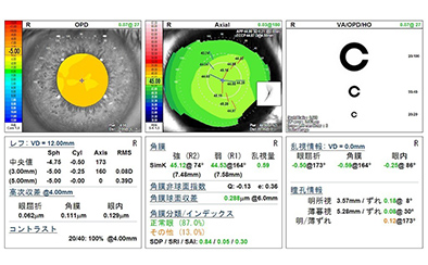 角膜の形状や屈折度、乱視の有無などを分析するための検査です。白内障手術に使用する眼内レンズの選定や、手術前後の評価に役立ちます。