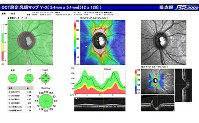 眼底を断層的に撮影し、網膜や視神経の厚み・構造を立体的に解析します。肉眼では見えない微細な変化を把握し、より正確な診断を行うために有効です。